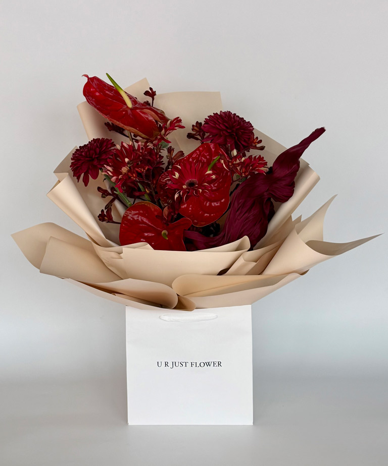A bold and luxurious arrangement featuring striking red anthuriums, deep crimson blooms, and rich textures, beautifully wrapped to create a powerful statement of passion, elegance, and modern sophistication.