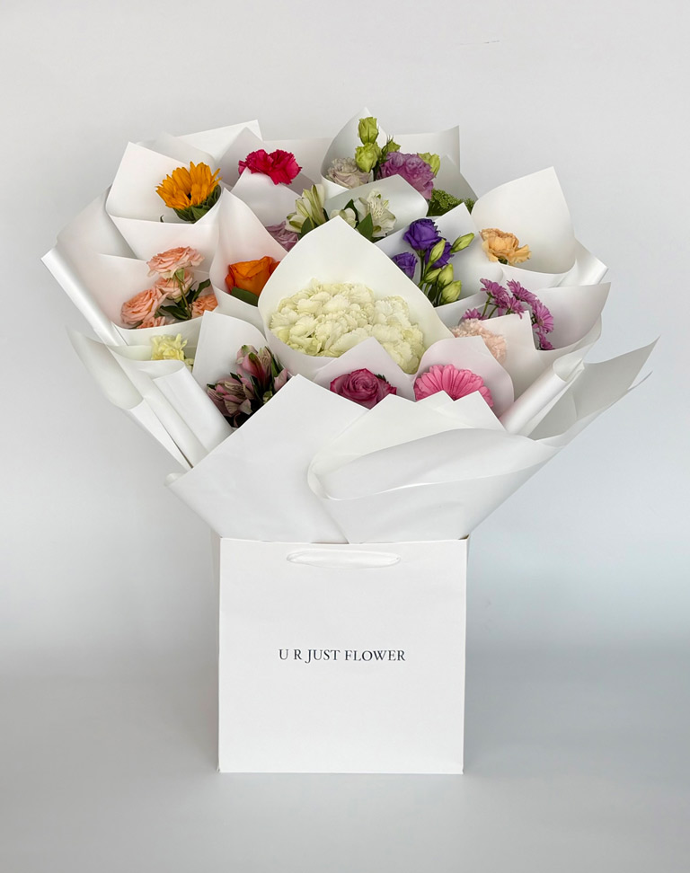 An artistic arrangement featuring a curated selection of seasonal blooms, each individually wrapped and thoughtfully combined into one unique composition.