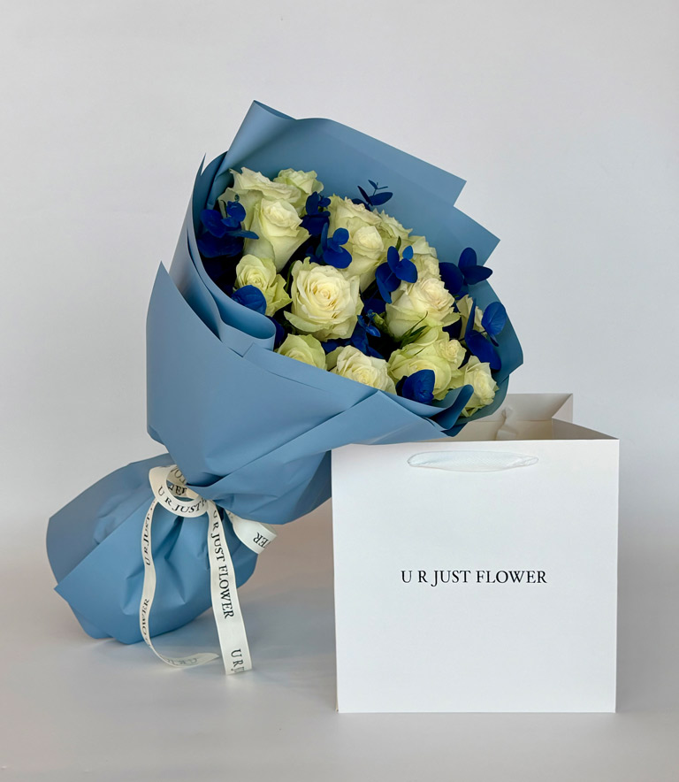 A refined and elegant bouquet featuring soft ivory roses contrasted with striking blue accents, beautifully wrapped to create a modern and sophisticated look. Its unique color combination makes it a perfect choice for memorable moments and distinctive gestures.
