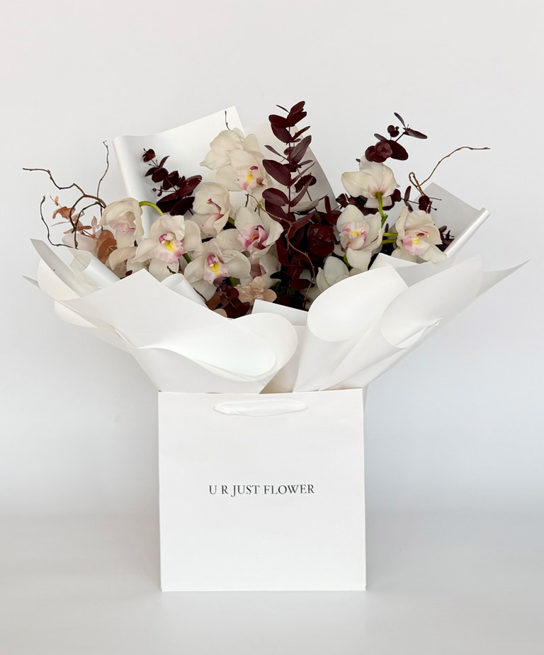 An elegant arrangement of delicate white orchids paired with deep burgundy foliage, creating a bold yet refined composition.