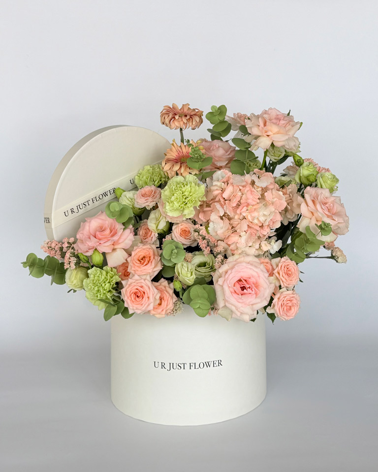 A graceful arrangement of soft peach roses and fresh green accents, elegantly styled to bring a sense of calm beauty and natural charm. Designed in a signature box, it is perfect for warm, thoughtful gifting.