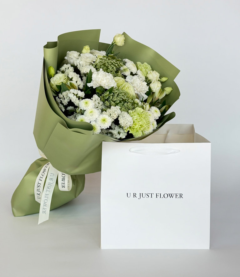 A fresh and calming bouquet featuring a soft blend of white blooms and gentle green tones, beautifully arranged to create a sense of peace, purity, and natural elegance. Its clean and minimal look makes it perfect for thoughtful gestures and serene moments.